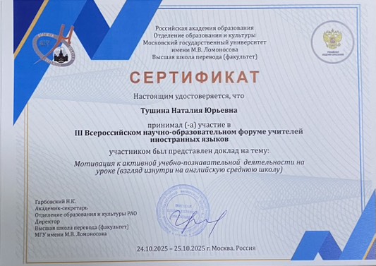 В Москве состоялся III Всероссийский научно-образовательный форум учителей иностранных языков, организованный Российской академией образования и Высшей школой перевода МГУ имени М.В. Ломоносова. Учитель английского языка нашей школы, Тушина Наталия Юрьевна, приняла участие в форуме и выступила с докладом на тему "Мотивация к активной учебно-познавательной деятельности на уроке (взгляд изнутри на английскую среднюю школу)". Два года назад Наталия Юрьевна также принимала участие в этом форуме и делилась своим опытом работы.